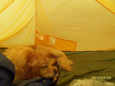Det ble ganske vått inni teltet med våt hund og mine blaute klær, men var godt å sitte tørt å spise maten. Meg og Tone satt å ropte litt til hverandre i hvert sitt telt, he he. Heldigvis stoppet regnet da vi skulle ut igjen og teltene ble pakket ned igjen.